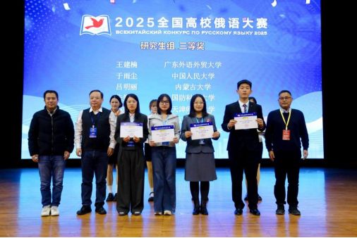 2025年10月25至26日,由中华人民共和国教育部主办、大连外国语大学承办的2025全国高校俄语大赛在大连顺利举行。我院俄语系潘玲同学在比赛中表现优异,荣获研究生组全国三等奖,并成功获得教育部公派出国留学资格,丁美琳同学荣获低年级组优秀奖。